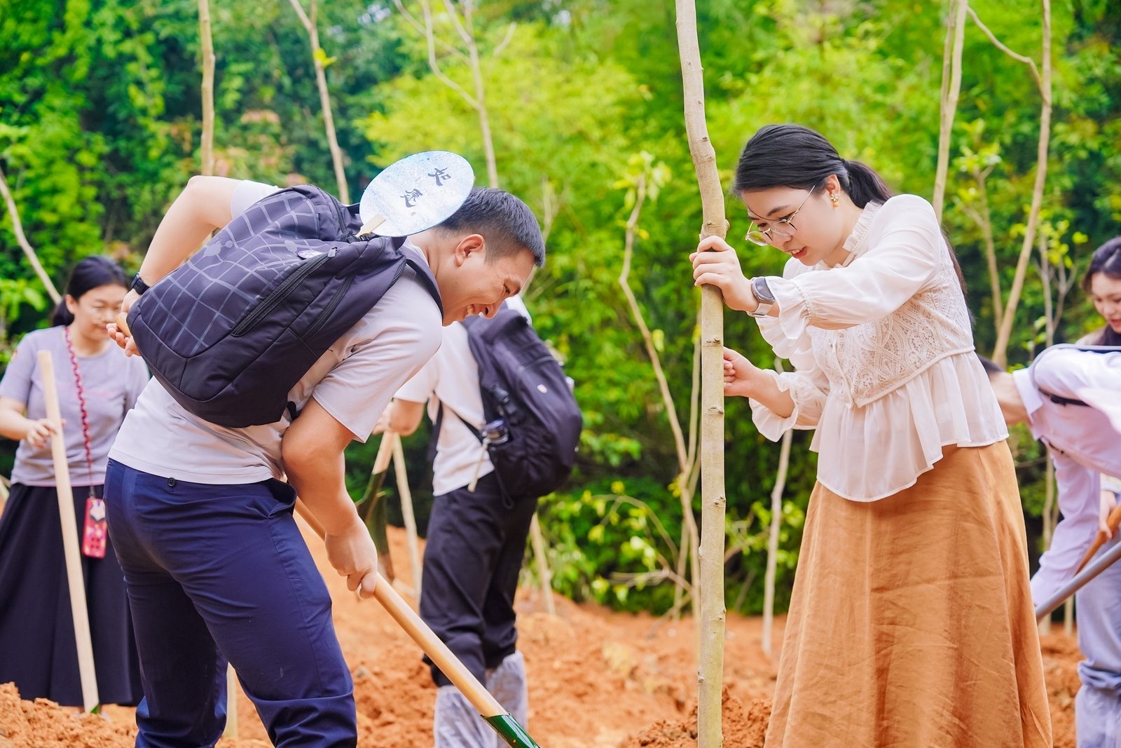 为积极响应绿美广东生态建设“有喜事 来种树”倡议,本次集体婚礼设“‘植’子之手,共植‘囍树’”环节,邀请新人共同种下象征婚姻长青的树木,让美好祝愿与树苗共成长。